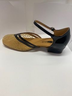 Low Heel Shoe with Black Patent Heel Cup and Gold Mesh Toe Box